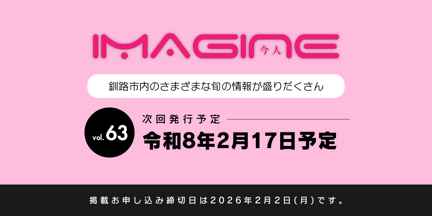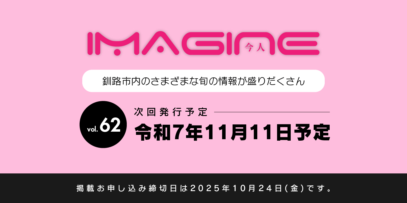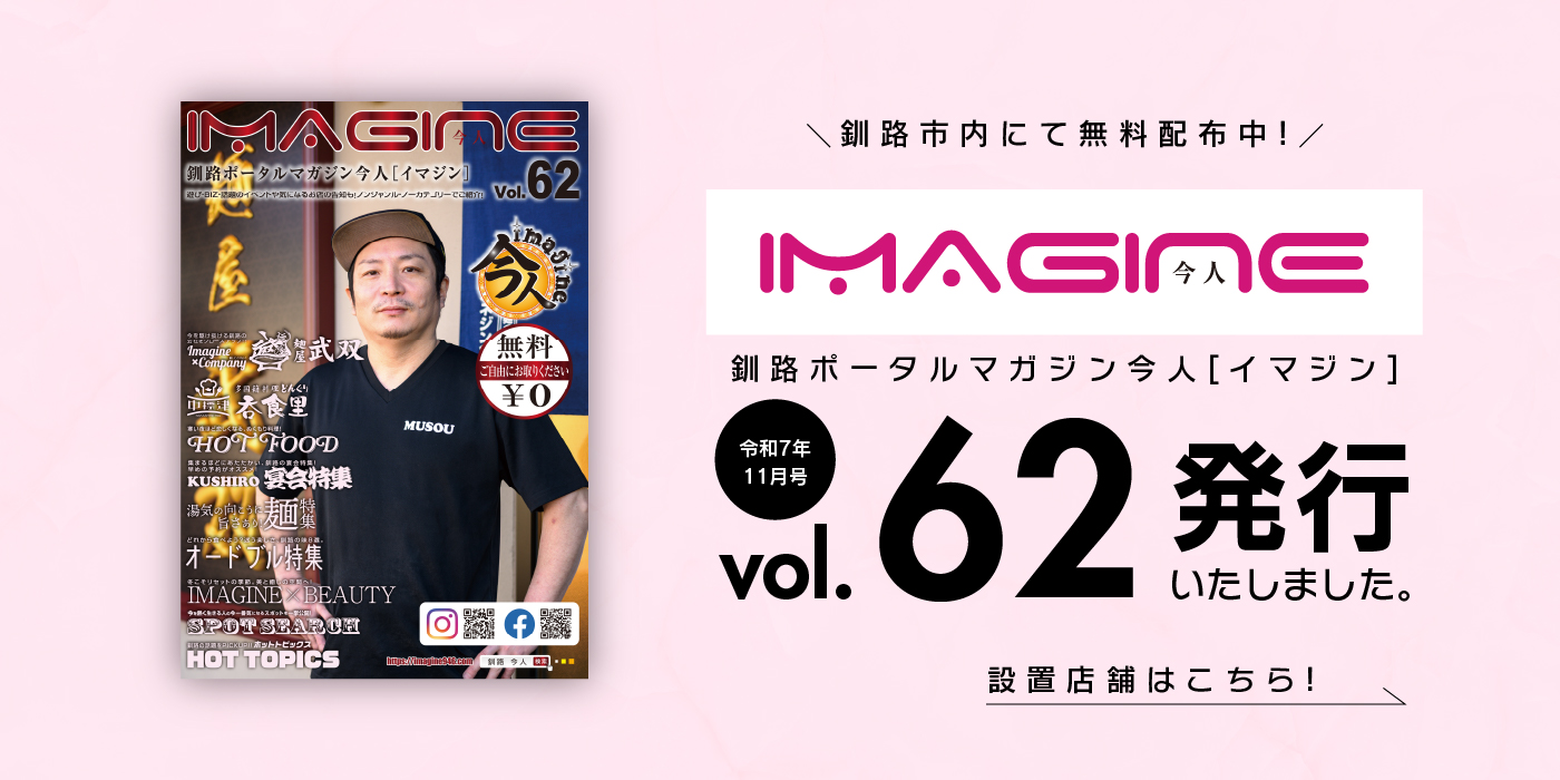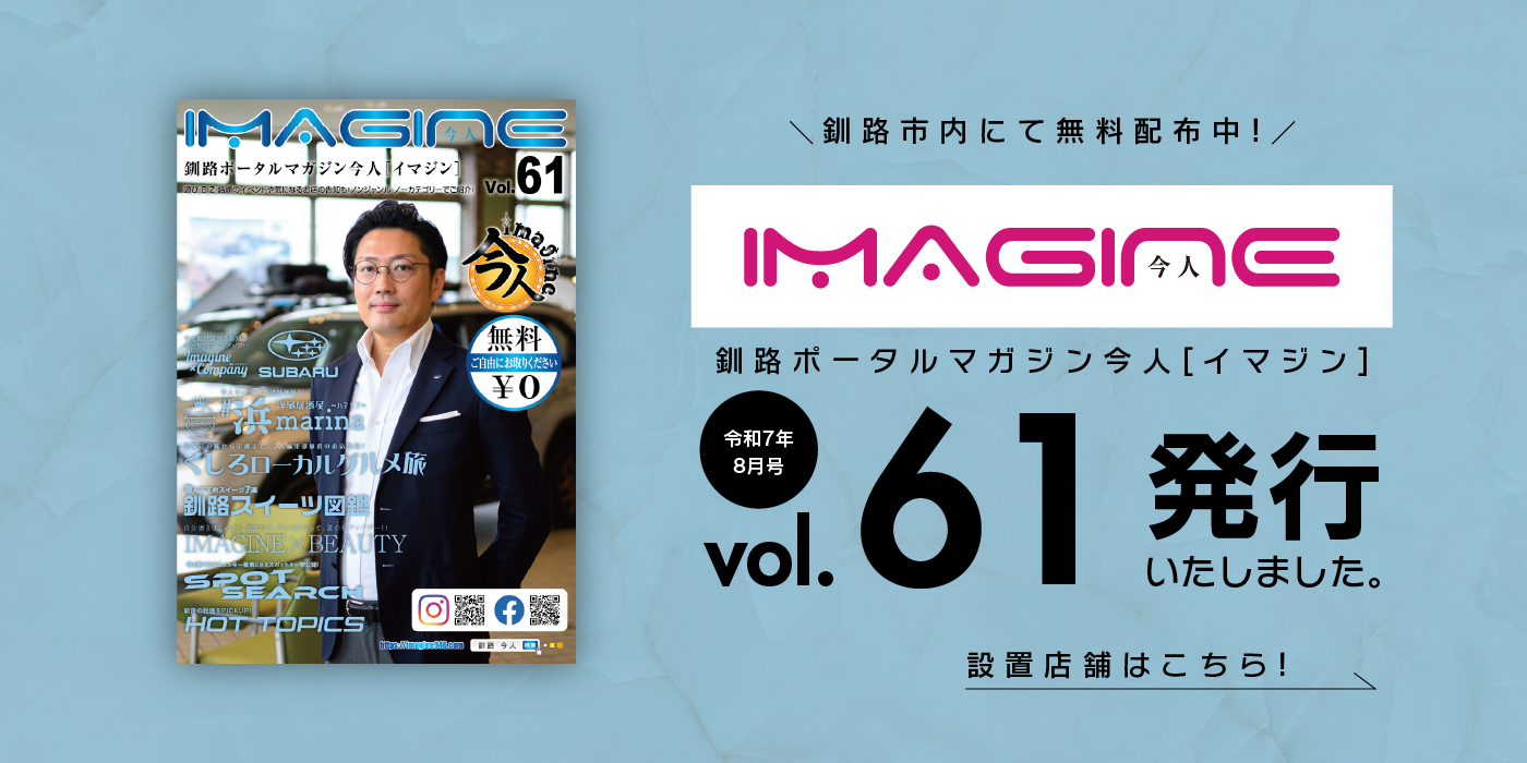 釧路で「今を生きる全ての人」と釧路をどんどん盛り上げたい!!そんな思いの元、今人〜imagine〜は創刊されました。釧路のライフワークをよりエンジョイできる最良のツールとして、「食べる」「楽しむ」「発見」「旬の話題」等、釧路の情報が盛り沢山のフリーペーパーです。A5サイズで、カバンに入れて持ち歩けて、更にwebとも連動しているので、いつでもタイムリーな情報が手に取れる、お客様、読者双方に取って訴求力のある最強ツールです。